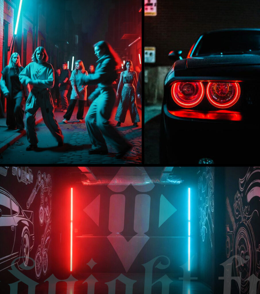 Świat marki: noc, miasto, samochody, ulice, kluby, czerwone i cyjanowe neony